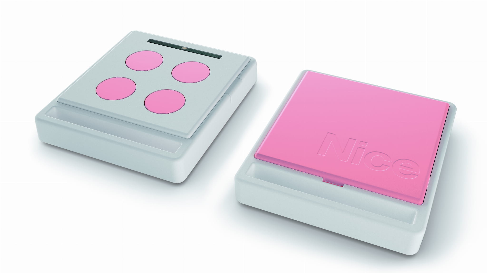 Pilot NiceHome, 4-kanałowy, biało-różowy. Pełne bezpieczeństwo - kod zmienny i 18 trylionów kombinacji. Wygodny - 4 przyciski dla kontroli wielu urządzeń + 5 dodatkowy kanał do sterowania oświetleniem. Ciekawy design.